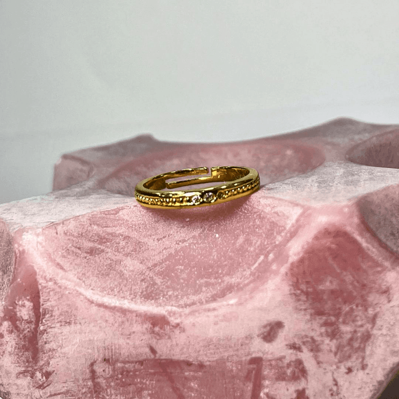 Anillo dorado con diseño detallado y elegante, trabajado con delicados grabados que recorren toda su circunferencia. Su acabado brillante y la textura ornamental lo convierten en una pieza sofisticada y atemporal, ideal para quienes buscan un accesorio versátil que combine estilo clásico con un toque distintivo.