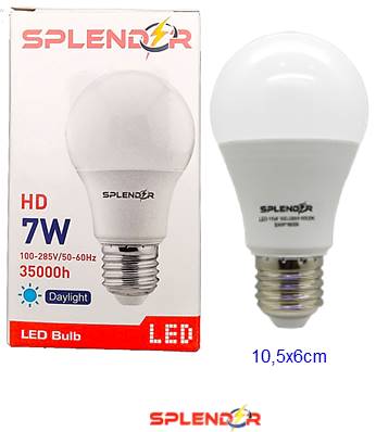 El SPLENDOR Bom A60 7W Led E27 MV 65K es una bombilla LED de consumo eficiente con el formato clásico de bulbo (A60) y rosca estándar E27. Cuenta con una potencia de 7W, equivalente a una incandescente de 50-60W, y emite una luz fría o blanca de 6500K, ideal para la iluminación funcional. Proporciona un flujo luminoso de aproximadamente 630 lúmenes (lm), es Multivoltaje (MV) (operando entre 85V a 265V AC), y posee una larga vida útil de unas 15.000 a 25.000 horas.