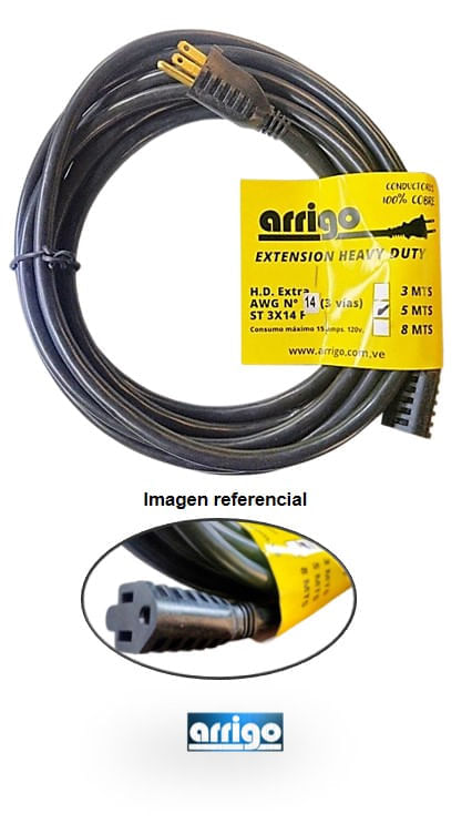 La Extensión Industrial Negra es un cable de extensión de uso rudo con 8 metros de longitud, diseñada para alta demanda energética. Utiliza un robusto cable tipo ST de tres conductores calibre 14 AWG (3x14), garantizando conexión con polo a tierra para máxima seguridad y una capacidad de hasta 15 Amperios (1875W). Su construcción reforzada y color negro la hacen ideal para conectar herramientas pesadas y equipos de alto consumo en entornos industriales y de construcción.