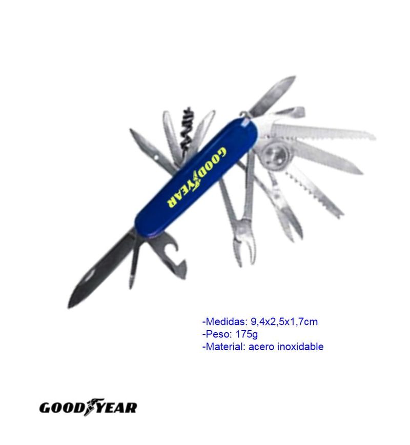 La GY211 de GOODYEAR es una navaja multifunción diseñada para ofrecer versatilidad y utilidad en actividades al aire libre, mantenimiento y emergencias. Con 19 funciones integradas, incluye herramientas como cuchilla principal, destornilladores, abrelatas, tijeras, lima, sierra, punzón, llaves y más, todo en un diseño compacto y plegable. Fabricada en acero resistente y con mango ergonómico, es ideal para llevar en el vehículo, mochila o caja de herramientas como solución práctica y confiable