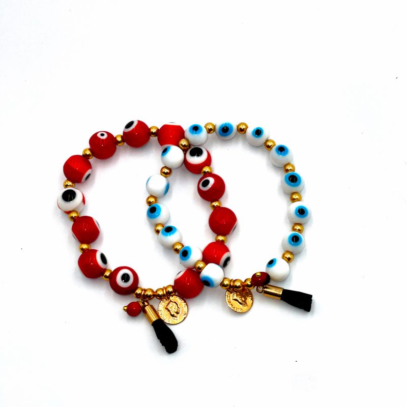Lleva contigo un símbolo milenario de protección y estilo. Combina el vibrante color rojo, tradicionalmente asociado con la fuerza y la protección contra envidias, con el celeste, que simboliza la paz y la purificación. Un accesorio con significado diseñado para acompañarte todos los días.